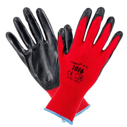 Poliészter alapú, csúszásbiztos kesztyű, szellőző kézháttal és gumírozott mandzsettával, érdesített tenyérrel, ergonómikus kialakítással, valamint a tenyerén nitril mártott!