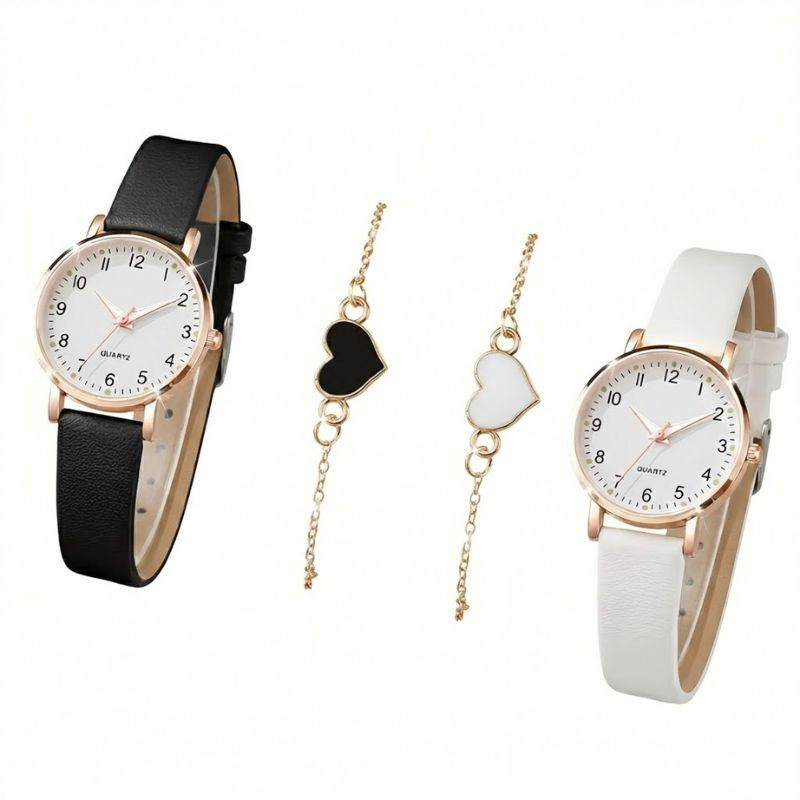 A szett tartalma: 2 db Karóra (fekete és fehér), 2 db Szív karkötő (fekete és fehér).