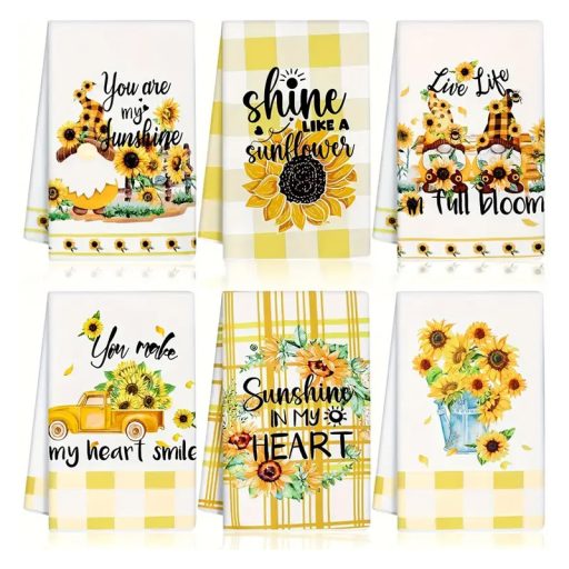 Ez a 6 darabos, napraforgó témájú mikroszálas konyharuha szett tökéletes választás minden vidám és praktikus konyhai környezetbe. A friss, napfényes minták és inspiráló feliratok nemcsak díszítik a konyhát, hanem funkcionálisan is kiválóan helytállnak a mindennapokban.