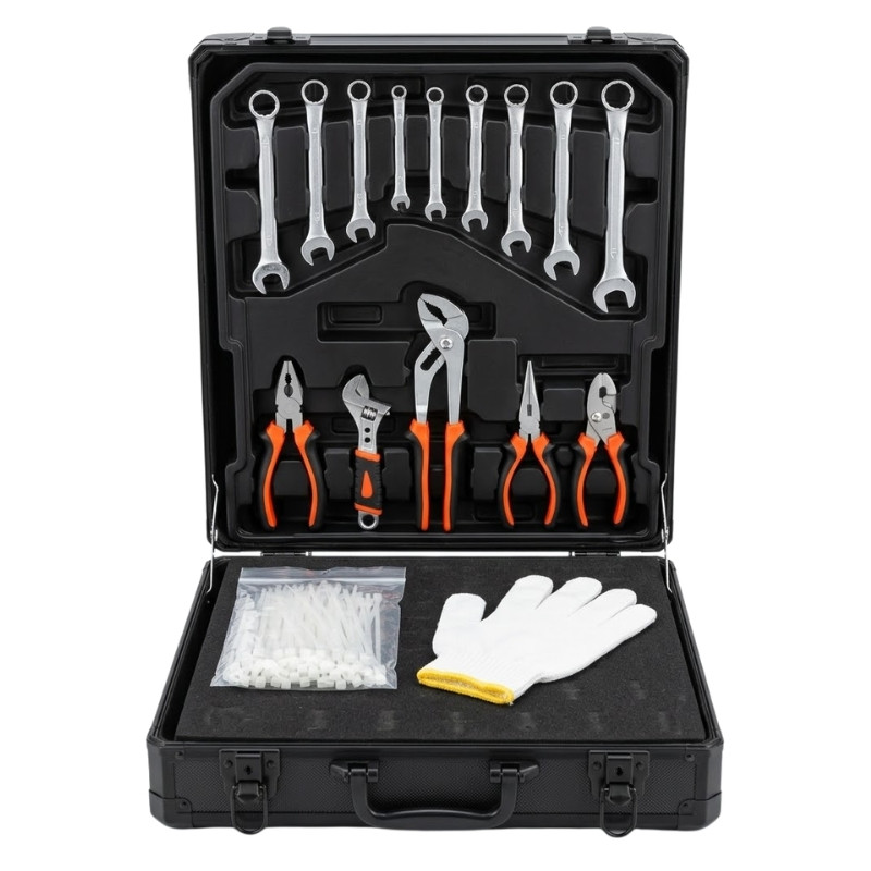 Nagyméretű, professzionális szerszámkészlet, amely minden szükséges eszközt tartalmaz otthoni, műhely- vagy ipari munkákhoz. A praktikus kofferben rendszerezetten tárolt elemek lehetővé teszik a gyors és hatékony munkavégzést.