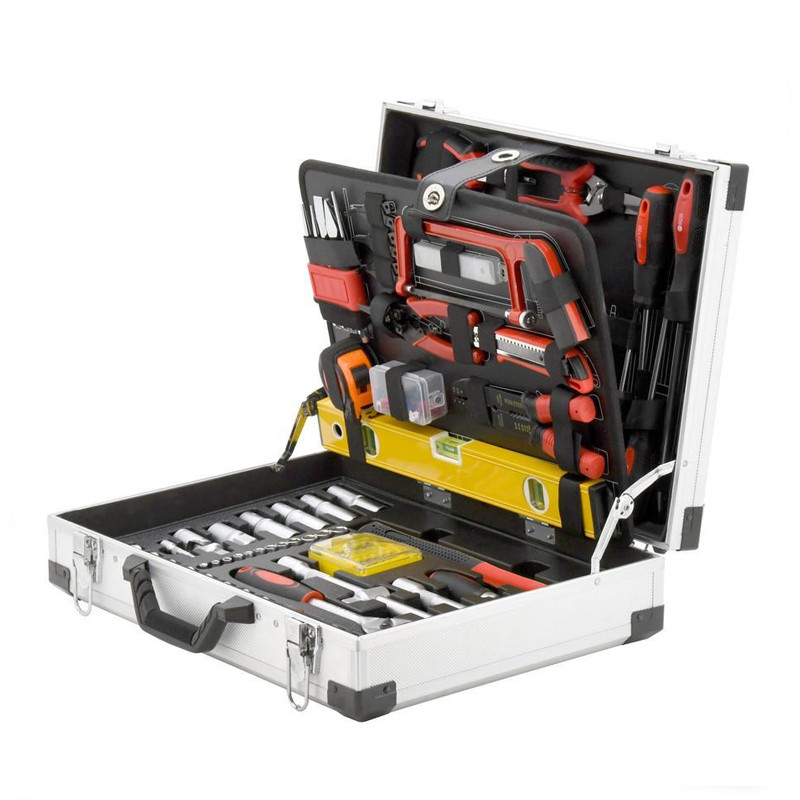 Kiváló minőségű, hordozható szerszámkészlet, amely minden alapvető eszközt tartalmaz az otthoni vagy műhelybeli javítási és karbantartási munkákhoz. A praktikus alumínium koffer jól áttekinthető, négy szinten elrendezett szerszámtálcákat rejt, amelyben minden eszköz saját helyet kapott.