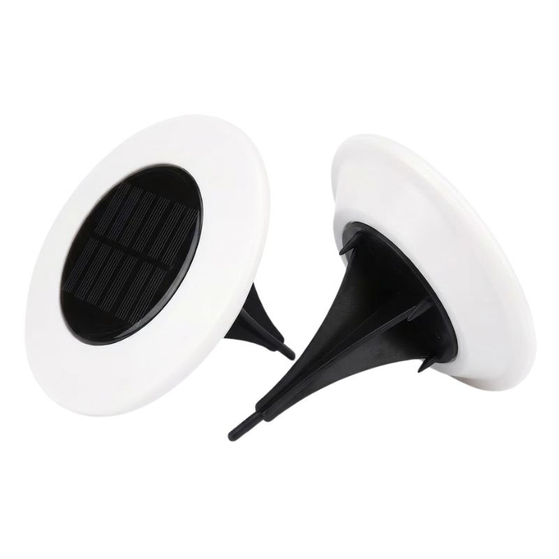 Kialakítás: Kerek, lapos forma vastag fehér peremmel, beépített napelemmel a közepén. A biztonságos és stabil rögzítést a csomagban található, földbe szúrható fekete műanyag tüskék garantálják.