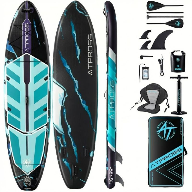 Ez az ATPROSS márkájú, élénk türkiz és sötétkék geometrikus mintával díszített álló eveződeszka (SUP) a tökéletes társ a vízi kalandokhoz. Legyen szó nyugodt tavi jógáról, tengeri szörfözésről, horgászatról vagy csak egy pihentető napozásról a vízen, ez az extra-széles kialakítású deszka kiemelkedő biztonságot és egyensúlyt nyújt minden felhasználó számára.
