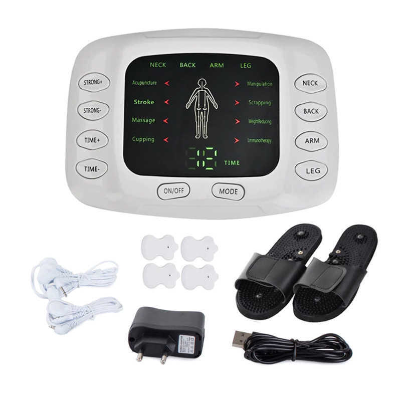 Ez a sokoldalú elektrostimulációs készülék a modern technológiát ötvözi a hagyományos kínai gyógyászat elveivel. A TENS és EMS technológia segítségével elektromos impulzusokat küld az izmoknak és idegeknek, ami hatékonyan csillapítja a fájdalmat, segíti az izmok regenerálódását és javítja a vérkeringést. A csomag különlegessége a masszázspapucs, amely a talp reflexzónáit stimulálja.