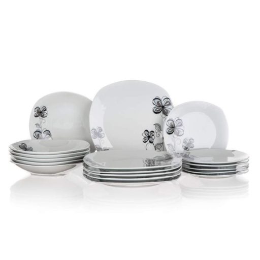 A FLOREA tányérkészlet a klasszikus eleganciát hozza el az étkezőasztalra. A minőségi fehér porcelánból készült, 18 darabos szett letisztult megjelenésével minden alkalomhoz illik, legyen szó hétköznapi ebédről vagy ünnepi vacsoráról. A készlet teljes körű megoldást nyújt hat személy részére, modern, enyhén szögletes formavilágával pedig feldobja a terítéket.