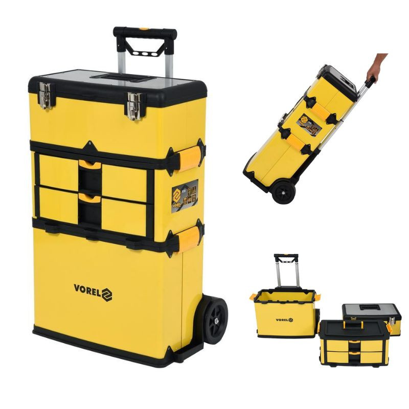 Háromrészes, mobil szerszámos kocsi kis szerszámok és kiegészítők rendezett tárolásához. Masszív ABS-kivitel, karc- és ütésálló felületek, acél munkalap a tetején — ideális műhelyekbe, garázsokba és karbantartási helyiségekbe.