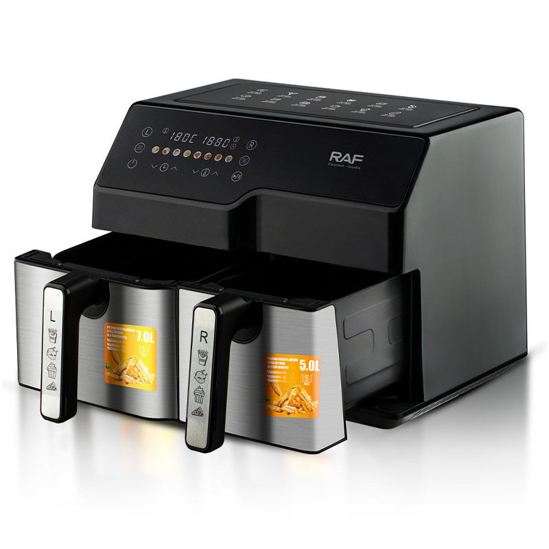 A RAF 9L (5,5l + 3,5l) levegős sütővel a főzés könnyebb és hatékonyabb. Két különböző élelmiszer sütéséhez, két különböző módon, ugyanabban az időben. Két külön sütőfiók segítségével különböző ételeket készíthet eltérő hőmérsékleteken, időpontokban és funkciókkal – mindkettőt ugyanabban az időben készítheti el!