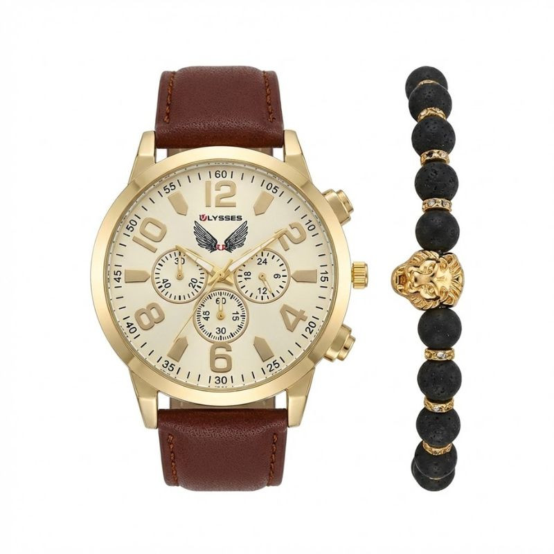 Ez az exkluzív ULYSSES ajándékszett a határozott férfiak kiegészítője. A csomag egy látványos, arany tónusú karórát és egy hozzá illő, divatos gyöngyös karkötőt tartalmaz. A mélyvörös (bordó) szíj és a pezsgőszínű számlap kombinációja klasszikus eleganciát sugároz, míg a karkötőn található párducfej a erőt és a dinamizmust szimbolizálja.