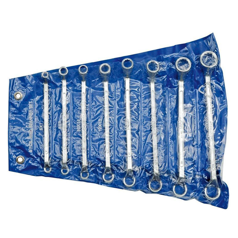8 darabos, hajlított kialakítású gyűrűs csillagkulcs készlet 6–22 mm méretben, kiváló minőségű CrV acélból.