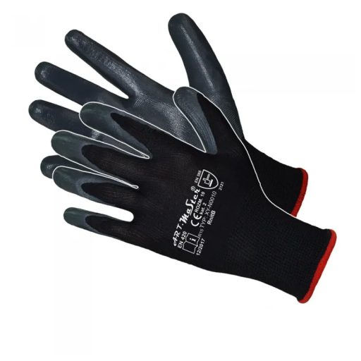 Poliészter alapú, csúszásbiztos kesztyű, szellőző kézháttal és gumírozott mandzsettával, érdesített tenyérrel, ergonómikus kialakítással, valamint a tenyerén nitril mártott!